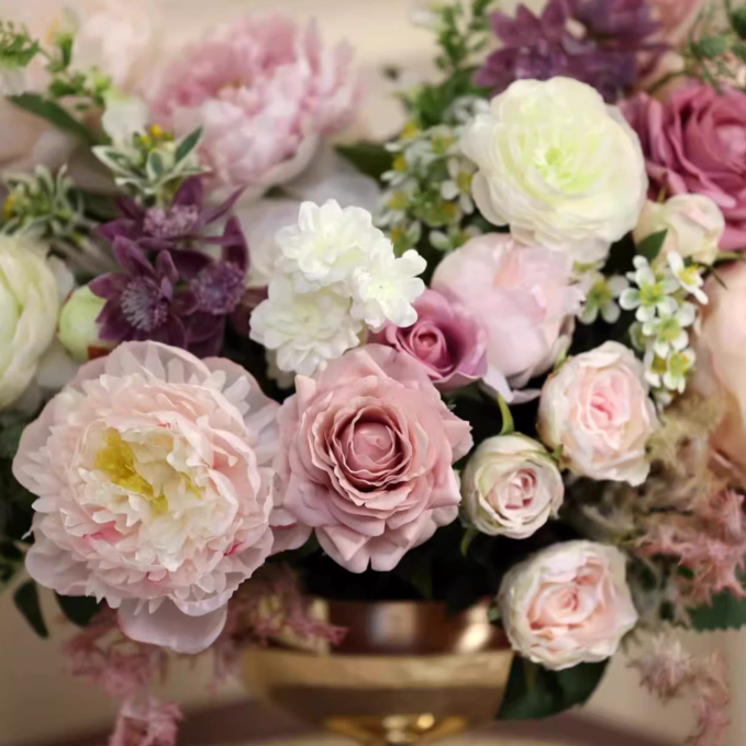 Inspired by French princess interiors, Blush Royale blends soft femininity with refined luxury. The floral arrangement rests atop a gilded pedestal vase, adding vertical elegance and ceremonial grace.