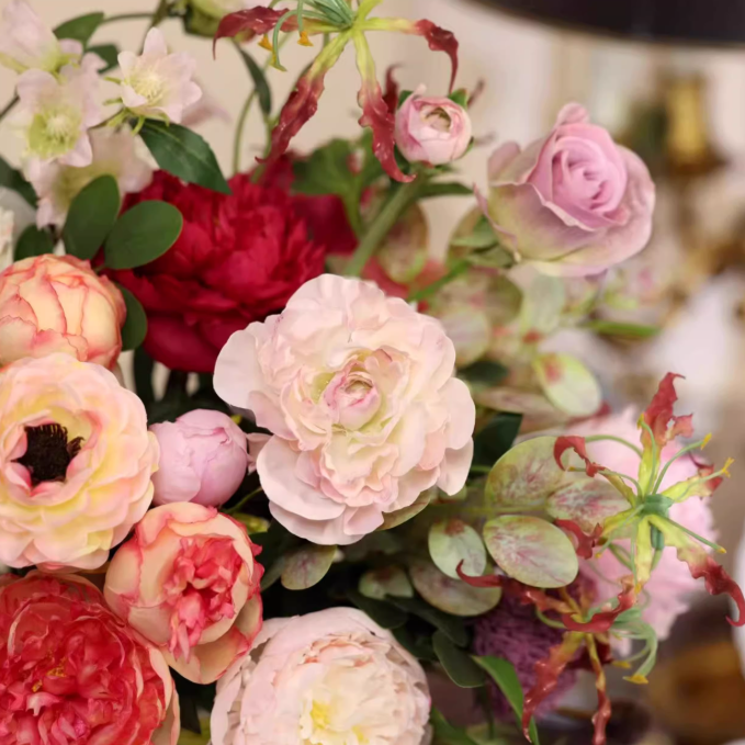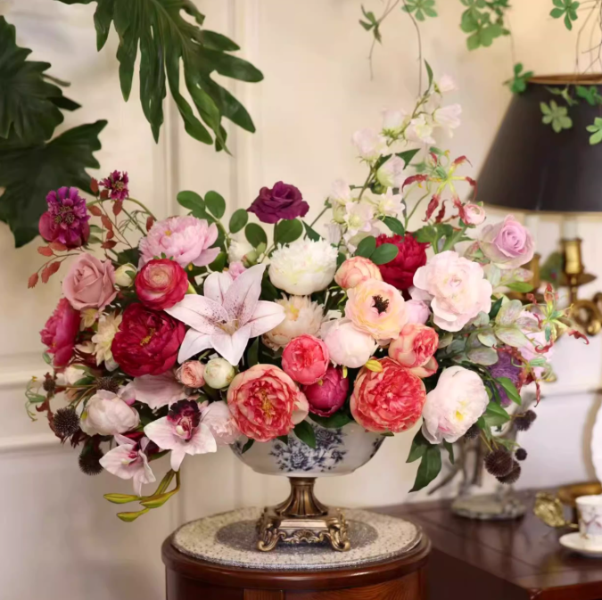 Porcelain Peony Muse – Oil Painting Style Faux Floral with Blue-Gold Vase