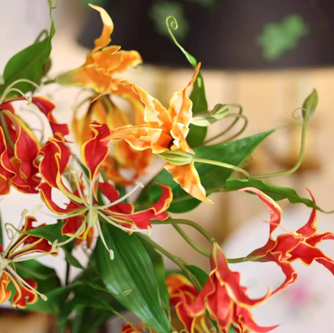 Made with high-grade faux silk flame lilies featuring multi-tone gradients from warm orange to golden yellow. Reinforced stems provide height stability and graceful posture.